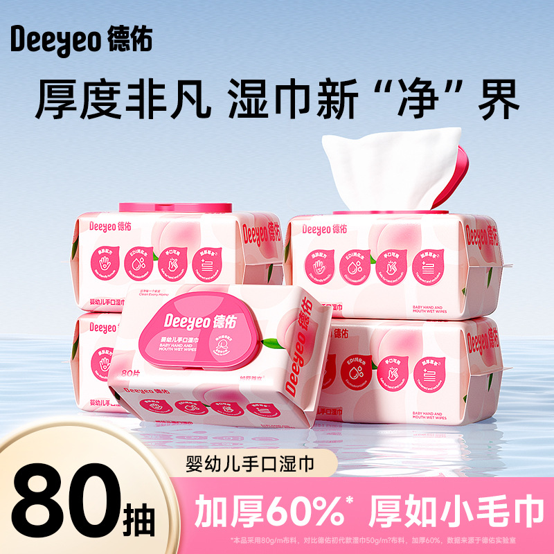 Deyou ベビーおしりふき ピーチリーフ 手・口・おなら専用 子供用ウェットティッシュ 80枚入 5パック ファミリーお手頃パック