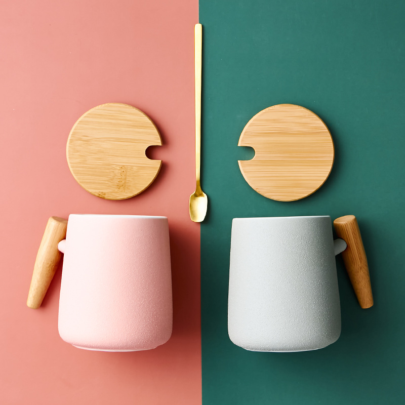 セラミックカップシンプル木柄カップクリエイティブトレンド木柄カップマグカップ蓋付きスプーン付きお土産カップ