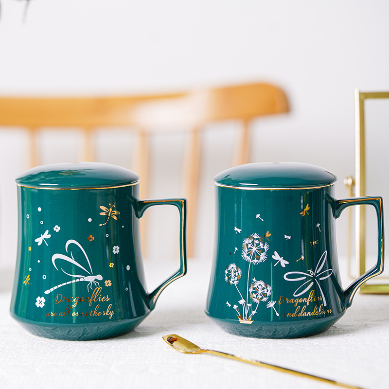 金辺陶磁器マグカップ家庭用オフィス大容量金葉カップ蓋付きスプーン付きマグカップカスタマイズ