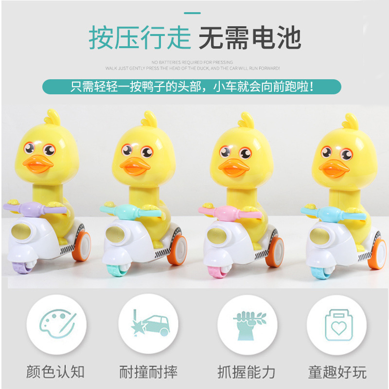 ネットの赤いボタンの小さい黄色のアヒルの回力車のオートバイの小さい黄色のアヒルの子は押して回力の子供のおもちゃの露店を押して売ります。