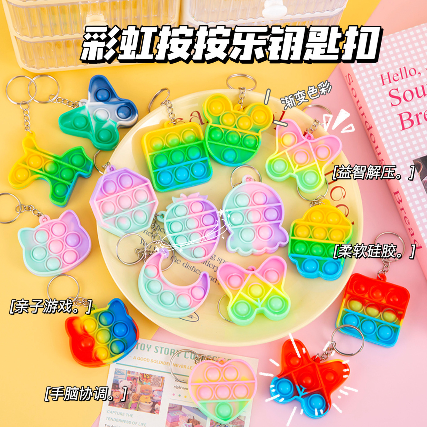 指で泡を押して遊んでいます。子供のおもちゃの小さいサイズは虹のキーホルダーのペンダントを減圧します。幼稚園のクロスボーダーです。