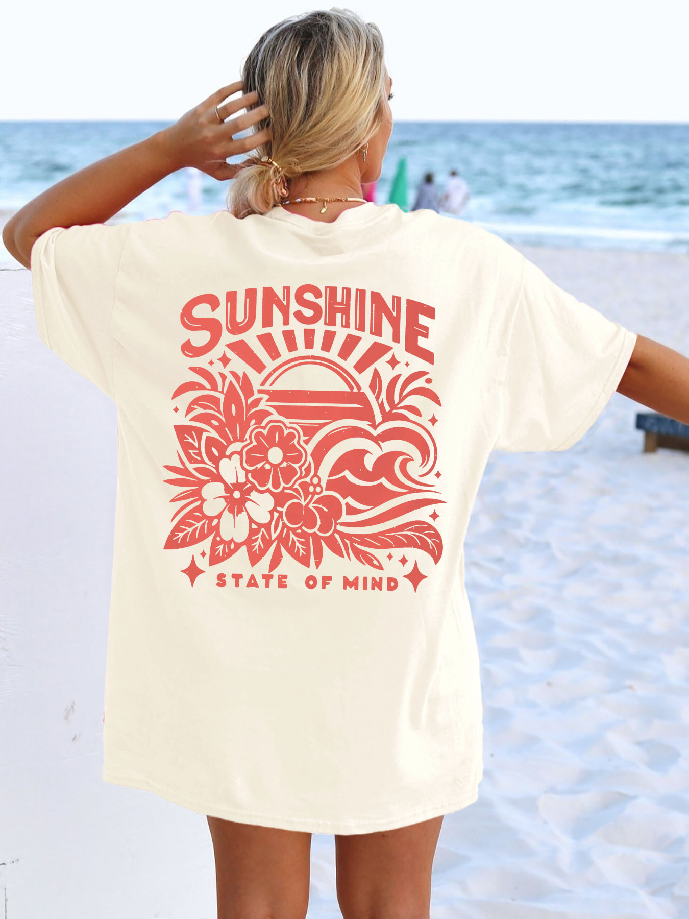 2025 新しいサンシャインプリントラウンドネック T シャツ、春と夏のカジュアル半袖、女性の黒アプリコットヨーロッパとアメリカの綿