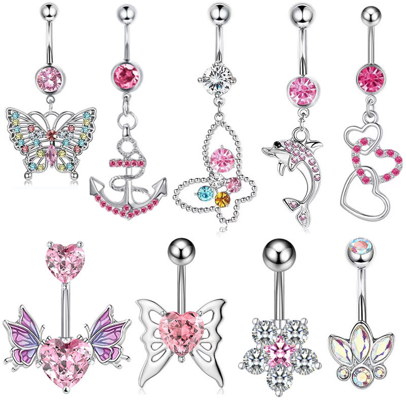ヨーロッパとアメリカのピンクシリーズの輝くダイヤモンドへそピアス、卸売ピアス、クリエイティブなジルコン、ホットガール向けの個性的なニッチなへそピアスジュエリー