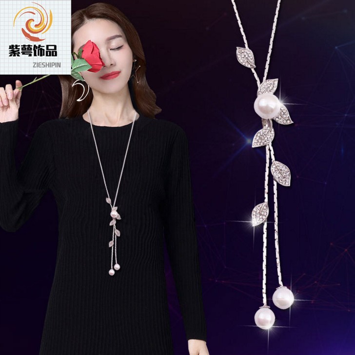 ロングスタイルのリーフパールタッセルセーターチェーン、女性用多用途韓国風パーソナライズアクセサリーネックレス、四つ葉のクローバー