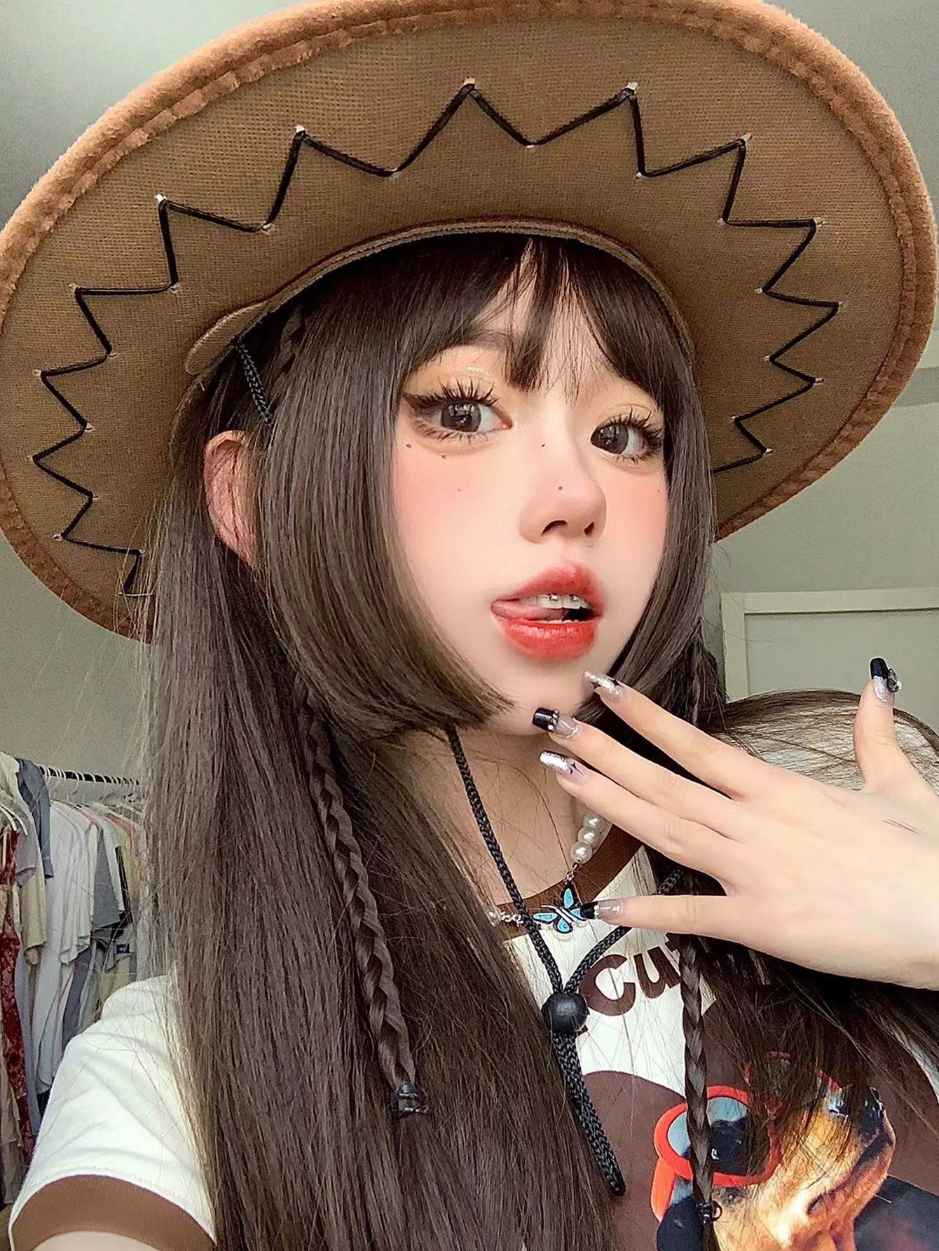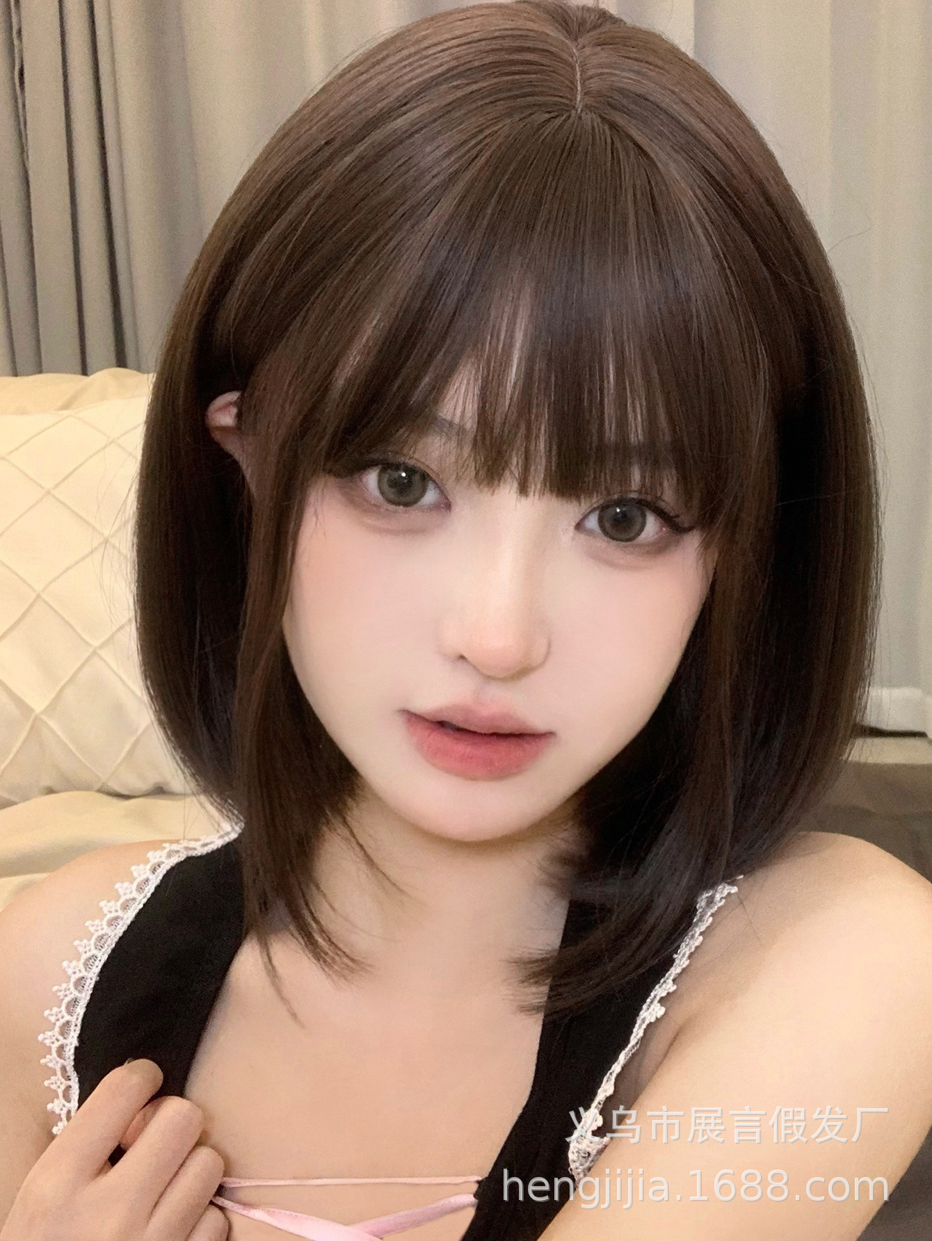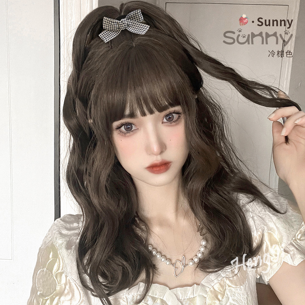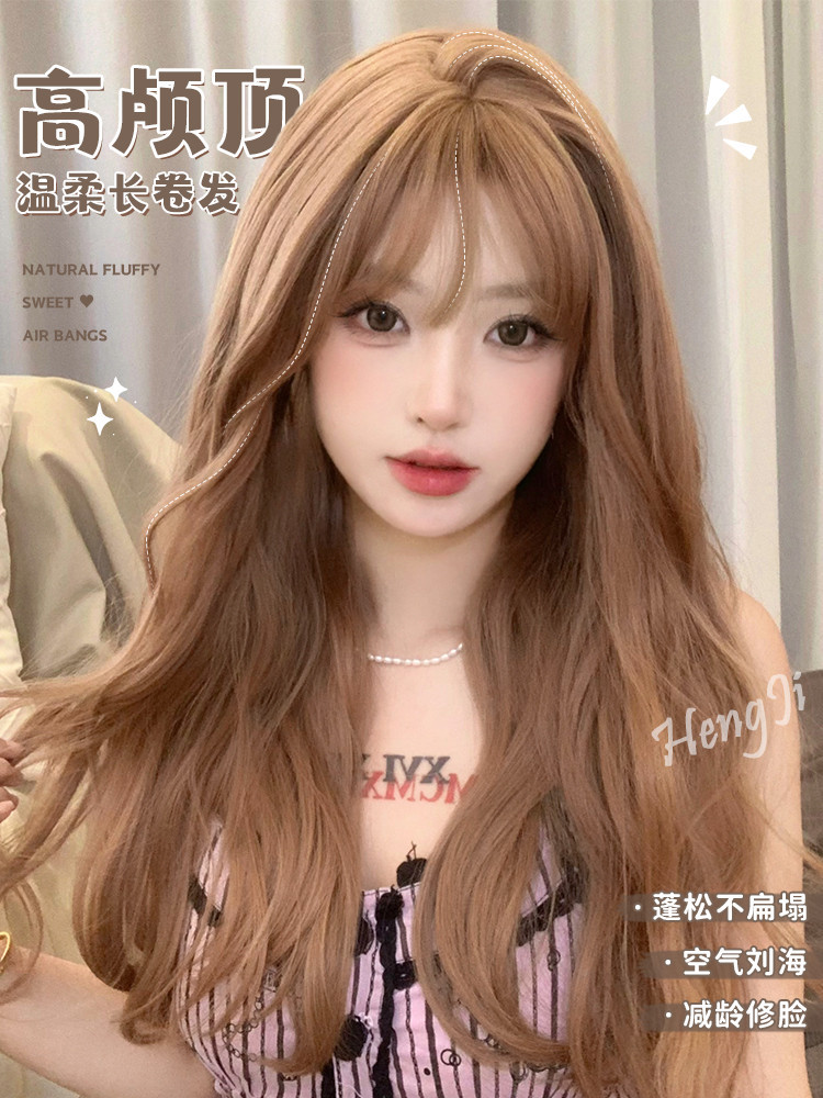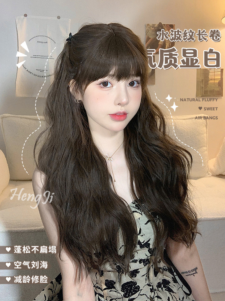 クロスボーダーかつらレディースミディアムロングヘア巻き髪空気前髪ナチュラルブラックコールドブラウン微巻きラウンドフェイスファッションネット赤オールカバー