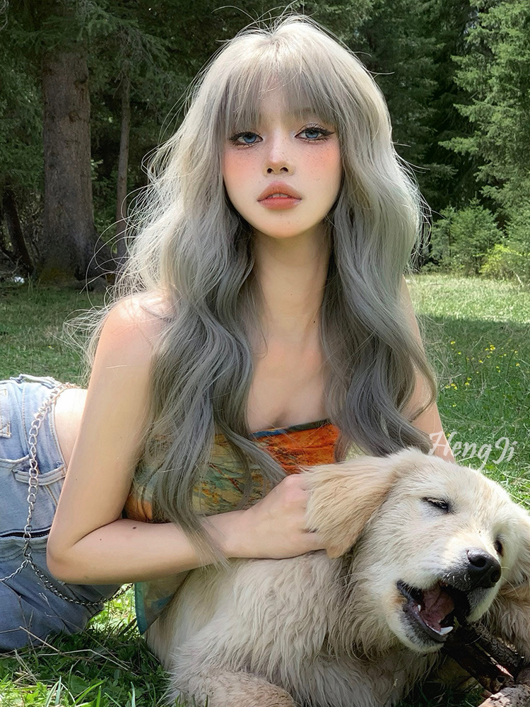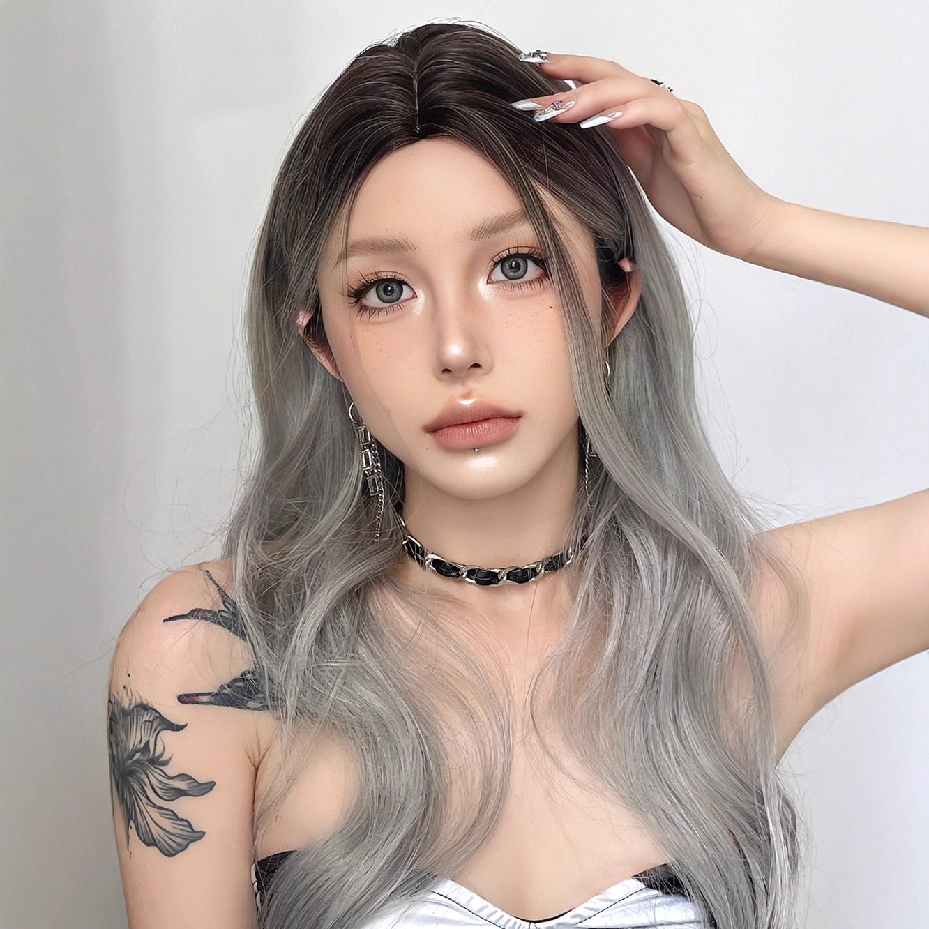 クロスボーダーかつらレディース长い髪グレー大きな波空気前髪ロングカールlolitaナチュラルフルヘッドカバースタイルかつら