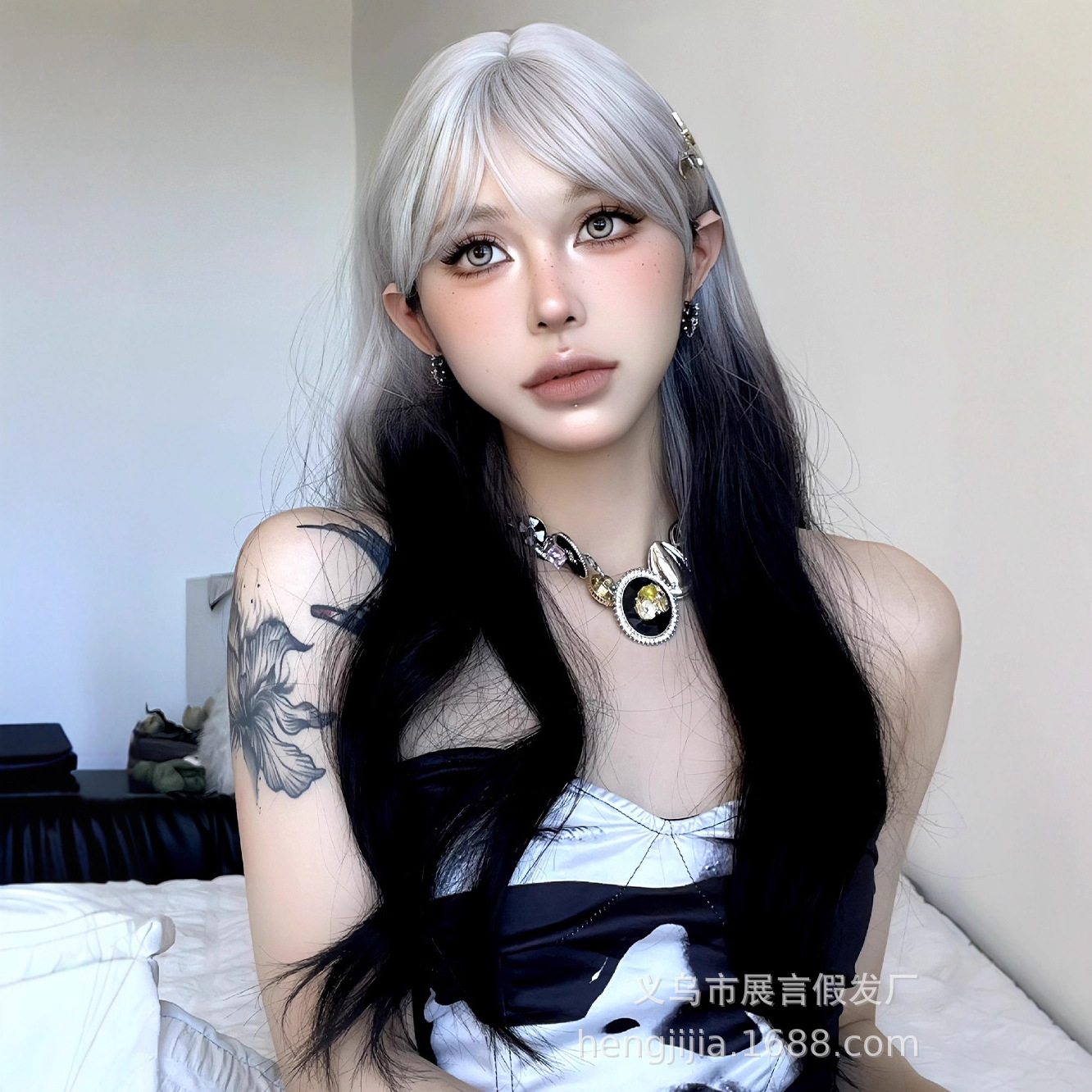 クロスボーダーのかつらの女性の長い巻き髪の大波の色の銀灰色の白いグラデーションの黒い全体の頭のカバーの女性団のゴシックの中で長い巻き髪