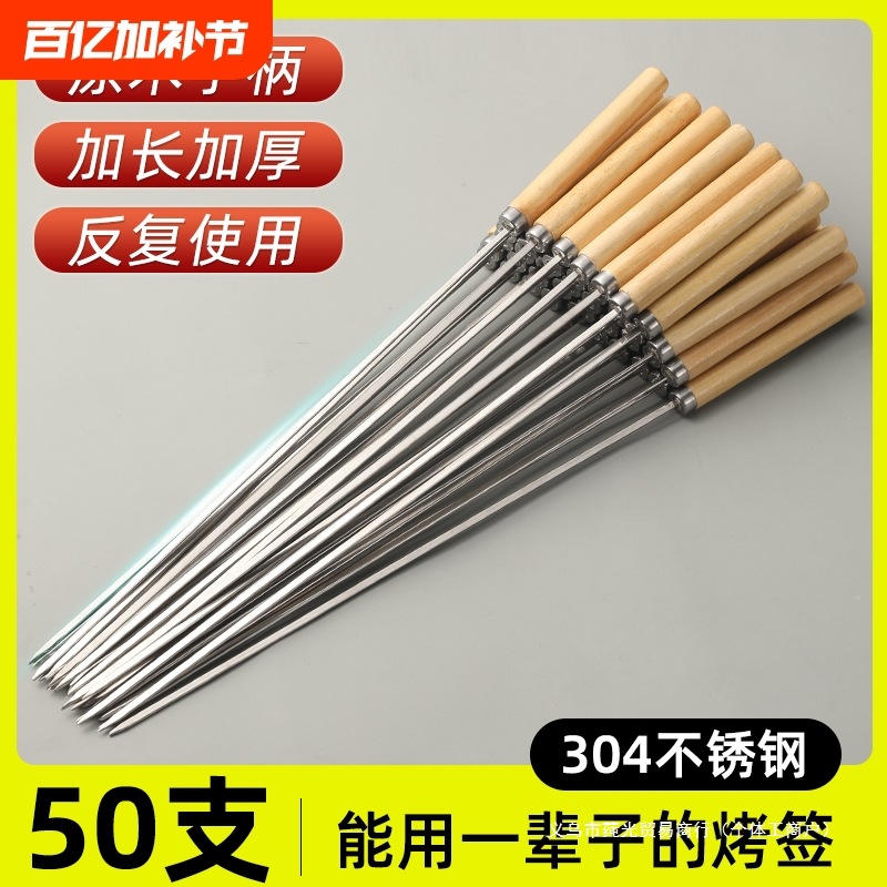 バーベキュースティック 304 ステンレス鋼木製ハンドル串ラウンド串ラム串串鉄串ツール家庭用フラット串