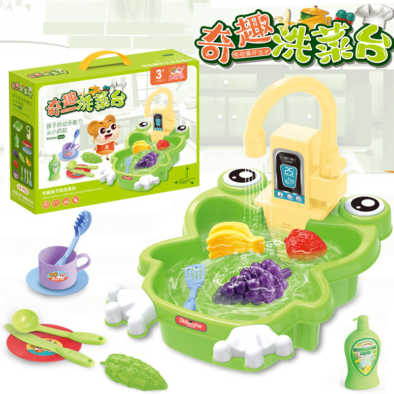 国境を越えた子供のままごとの漫画のカエルの食器洗い機は朝に台所の食器の電動の循環の水の食器洗い台のおもちゃを教えます。