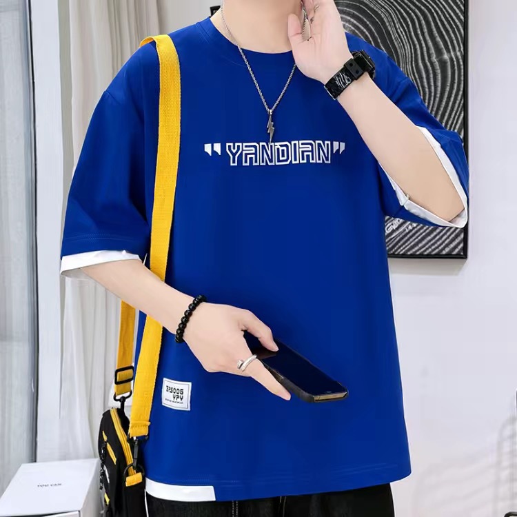 2025 新しい半袖 Tシャツメンズ韓国スタイル夏イントレンディなブランドルーズフェイクツーピーストレンディな多用途半袖トップス
