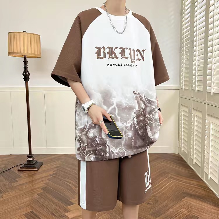 夏の男の子の半袖Tシャツ、ゆったりとしたトレンディなカジュアルスポーツ、メンズ学生パンツのツーピースセットの完全なセット