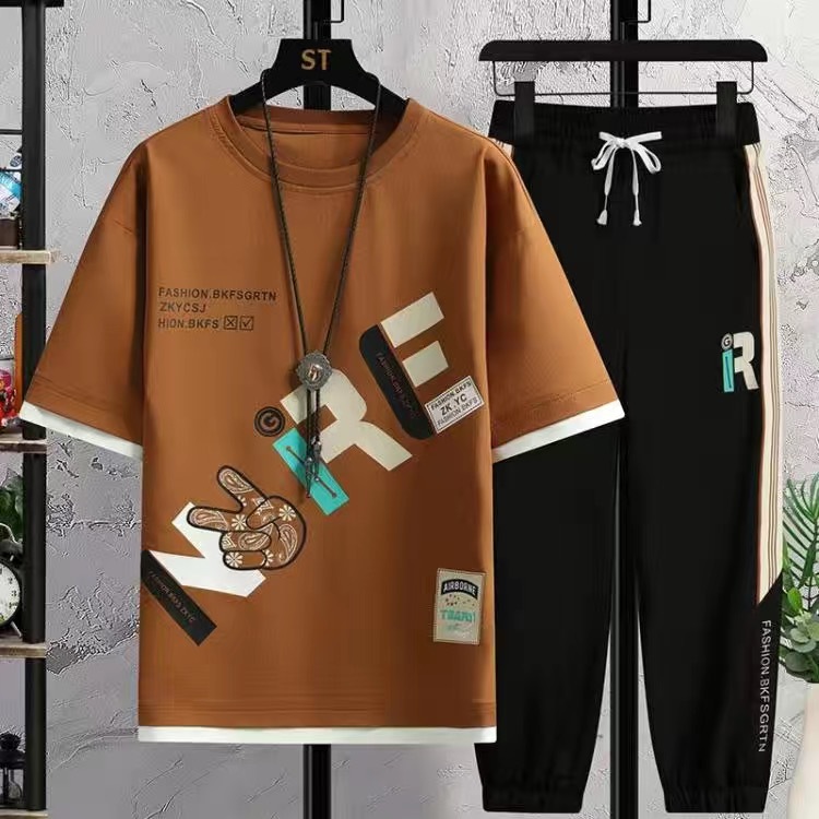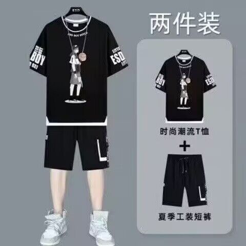 男の子用半袖Tシャツ一式、夏用、ハンサムな香港風ゆったりイン学生用半袖Tシャツスポーツスーツ