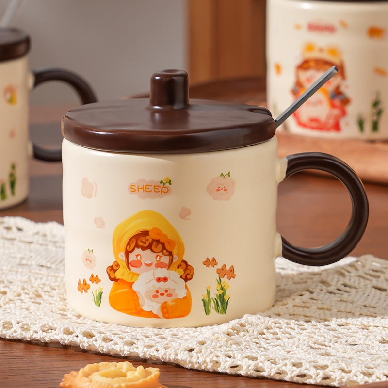 高颜値漫画陶磁器カップ女子学生蓋スプーン付きマグカップオフィス朝食コーヒーカップかわいいカップルカップ