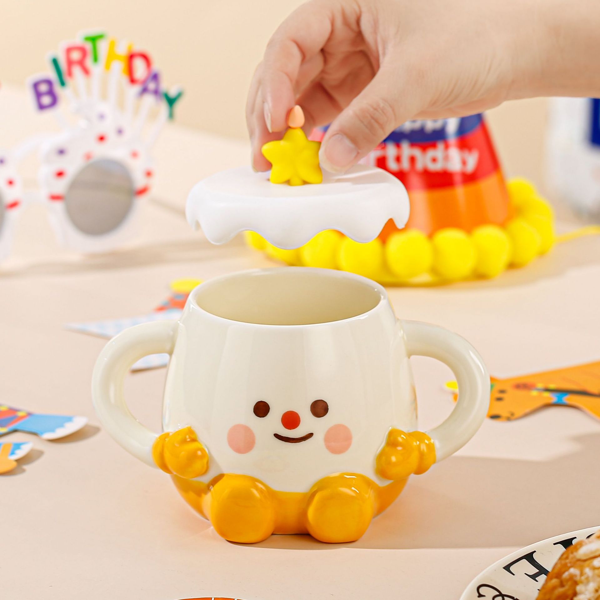 創意陶磁器のかわいいアニメの形の誕生日ケーキのろうそくの杯の高い顔の値の個性の伴う手の小さい贈り物のマグカップ