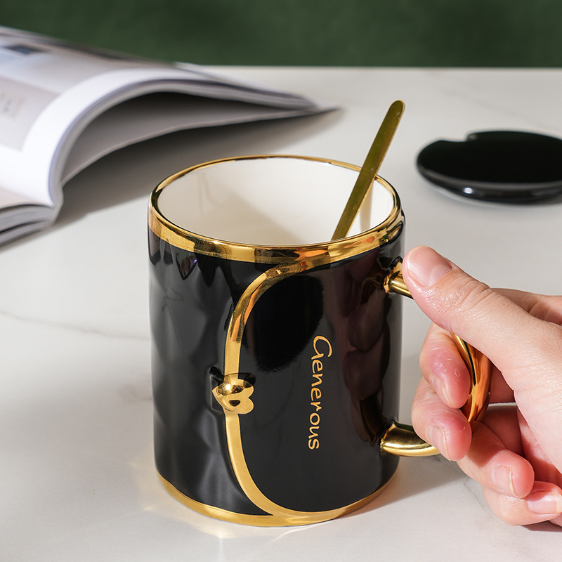 蝶結び創意水杯陶磁器ストライプ格高顔値マグカップ蓋付きスプーン北欧風ギフトカップお土産