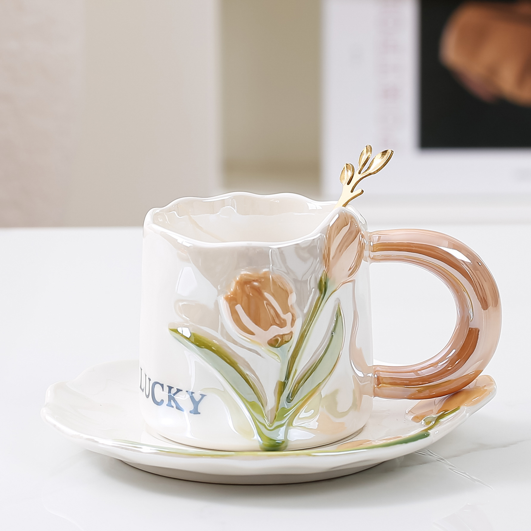 シンプルな風チューリップコーヒーカップ皿かわいい小さな花陶磁器カップ家庭用マグカップ女子オフィス