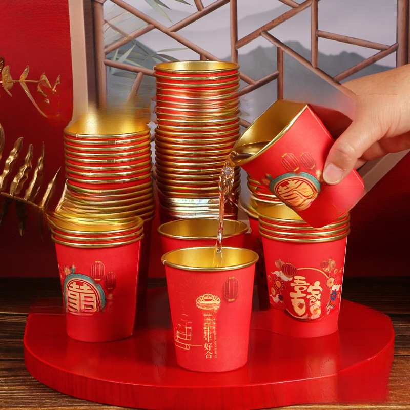 結婚使い捨て紙コップ新型厚手結婚式敬茶金箔祝い事赤い披露宴紙コップ家庭用