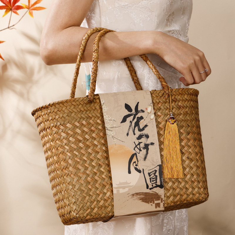 2025年レトロ中秋節麦わら製ハンドバスケット、卵黄月餅包装箱、会社グループ購入中秋節ギフトボックス