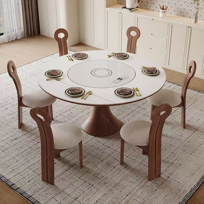 中古風実木食卓家庭用小戸型多機能帯暖菜電磁ストーブターンテーブル復古円形食卓椅子
