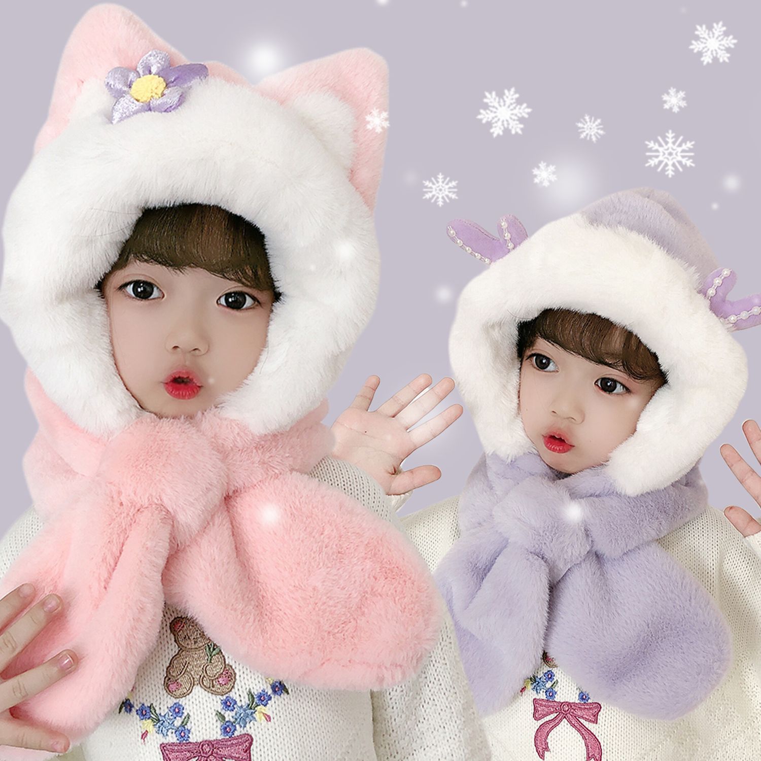 2025年新作 子供用帽子とスカーフの2点セット ふわふわで厚手の動く耳付きポニーネックウォーマー 漫画風のかわいい帽子