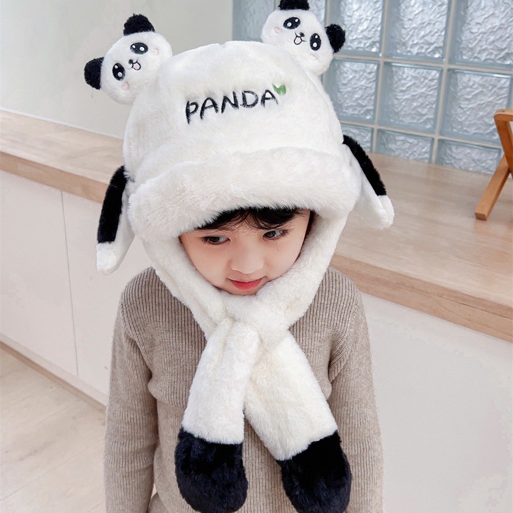 子供の漫画のパンダの毛の帽子は耳を動かして保温して厚い女の宝の耳の帽子のマフラーを厚くして首を囲む一体の帽子