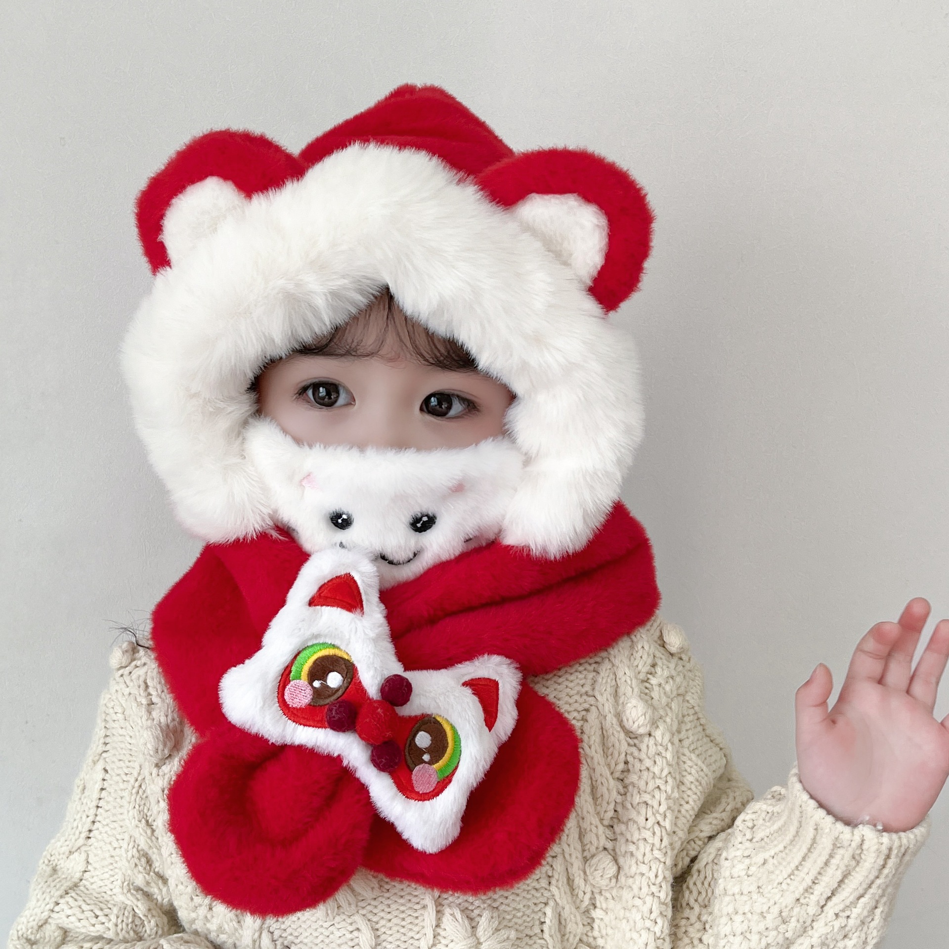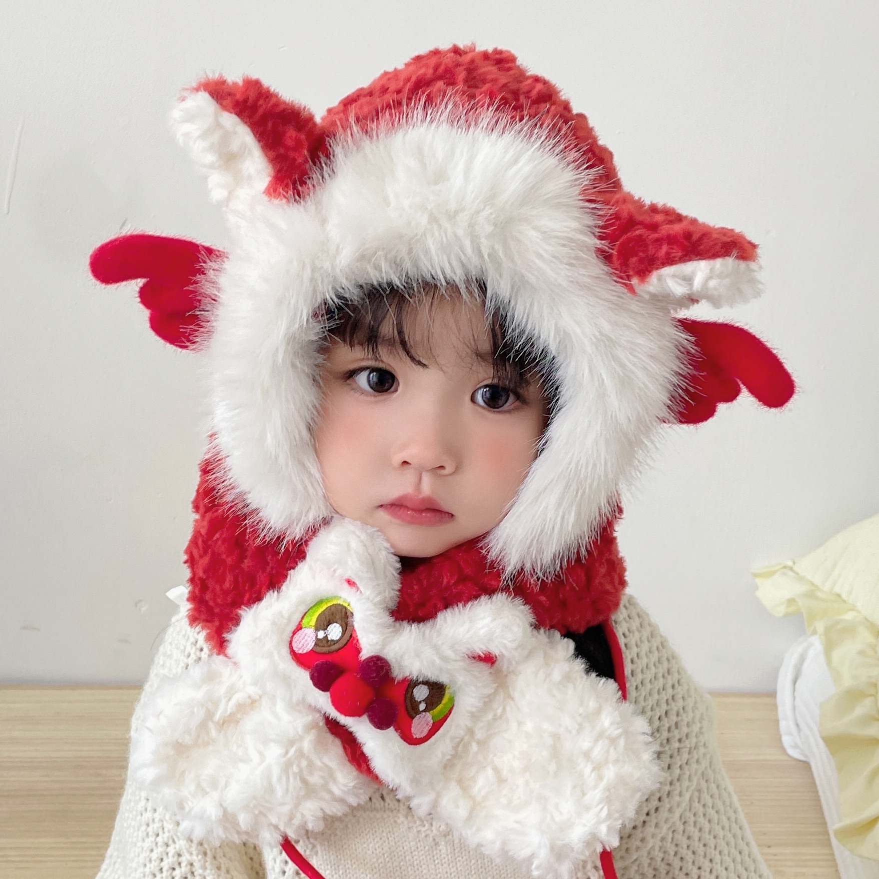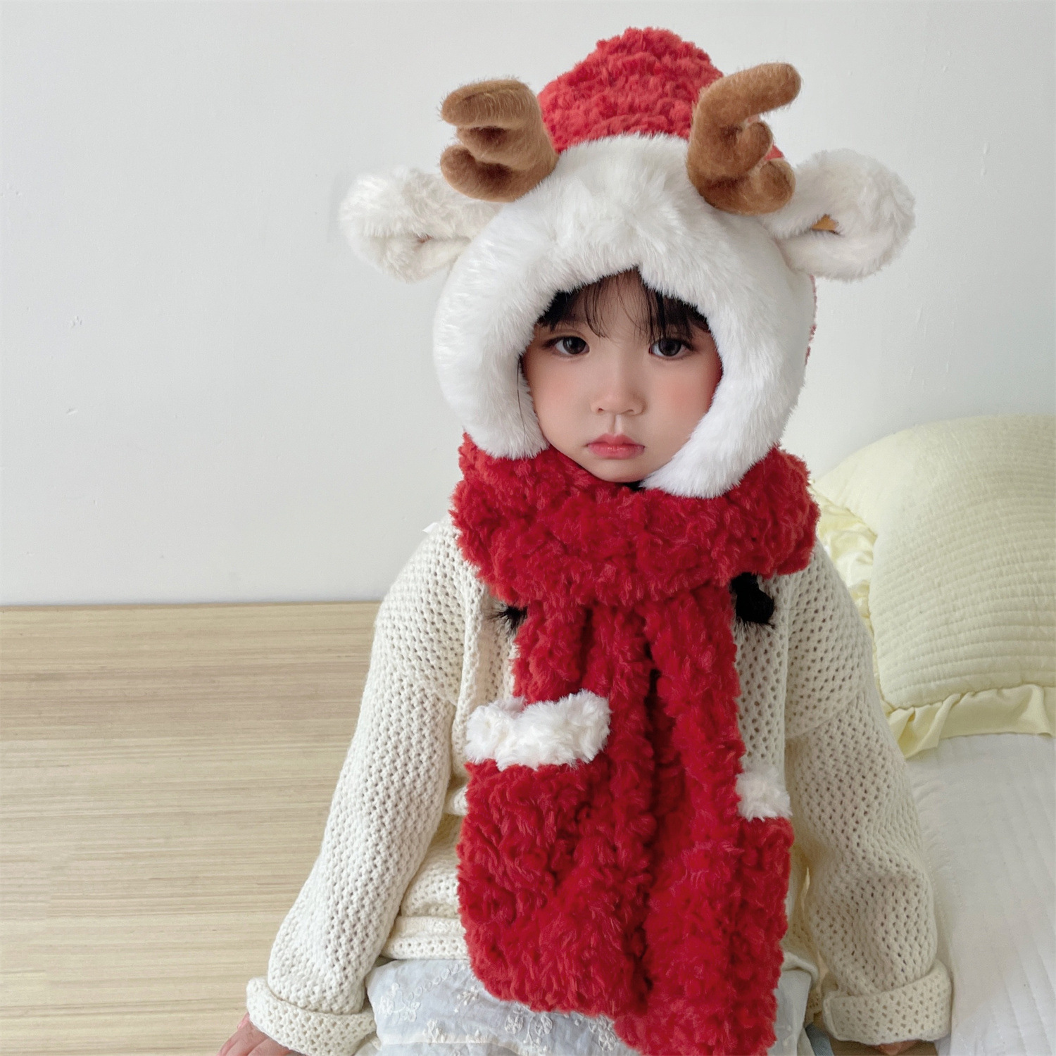 子供帽子冬女の子女の子新年耳当てスカーフ手袋一体キャップ子鹿赤ちゃんプルオーバークリスマス帽子