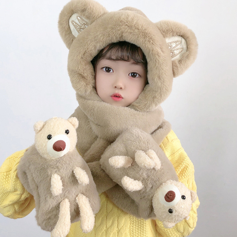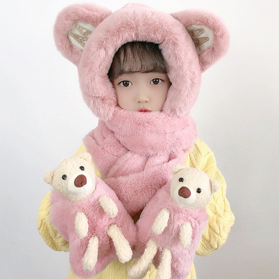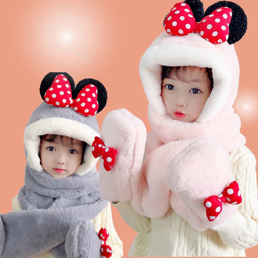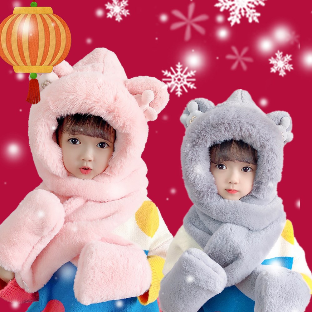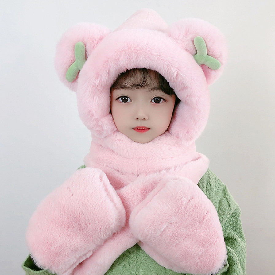 男女児童かわいい秋冬帽子マフラーマフラーマフラー手袋3点セットベルベット戸外パケットヘッダー一体帽子マフラー