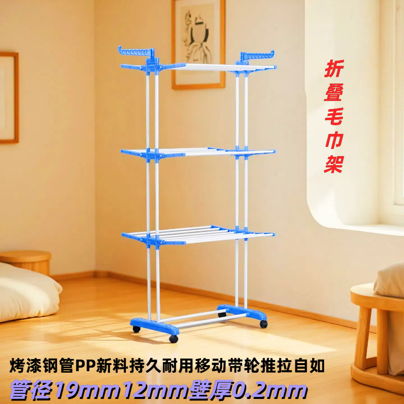 折りたたみ三層タオルラック美容院タオルラック折りたたみクロスボーダータオルラックダブルポール床置き衣類乾燥ラック