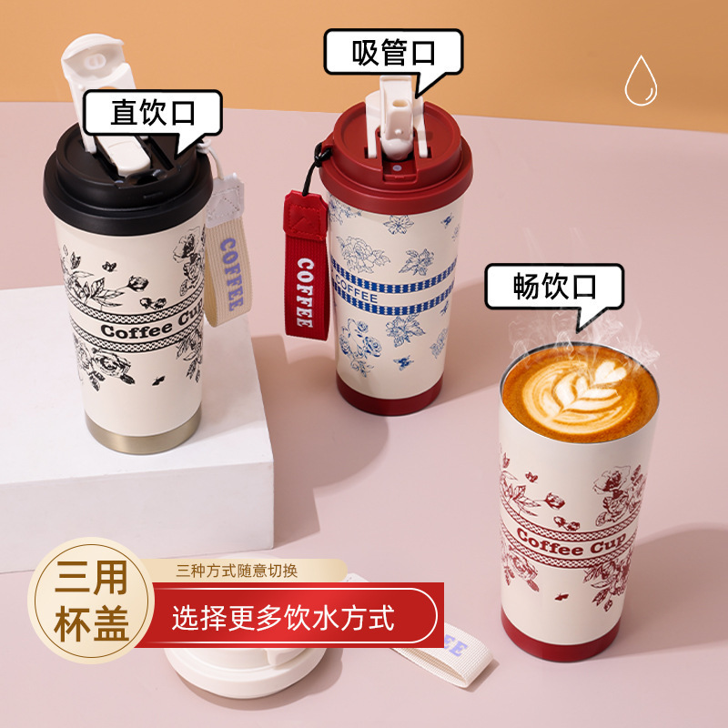 316ステンレスすずらん保温カップ高颜値三用カップ蓋コーヒーカップ大容量携帯ストローカップ