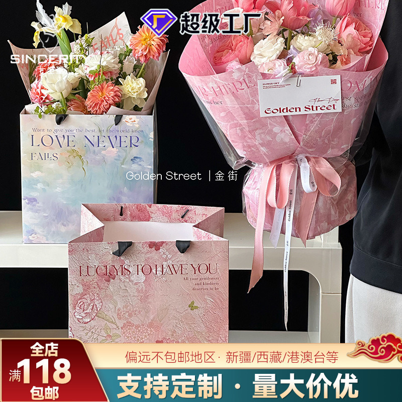 七色すみれ油絵スタイル手提げ袋と花束の花手提げ袋のプレゼント袋の高級感の包装箱の空き花芸