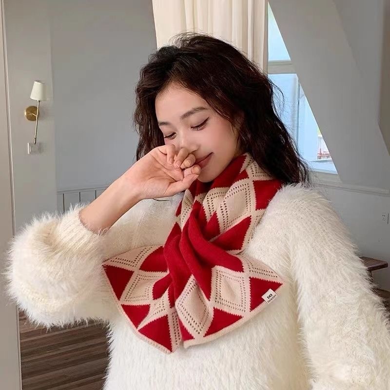 怠け者クロスマフラー新年赤シリーズ喜気百合雰囲気感ニット小マフラー秋冬保温マフラー