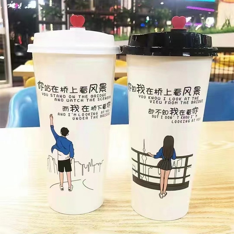 使い捨てミルクティーカップサブネット赤射出カップ研磨カップジュース飲料包装プラスチックカップ蓋付きロゴ