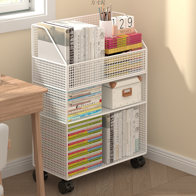 机の下の物置棚は移動可能です。小さな本棚の机の横に物置棚を収納します。