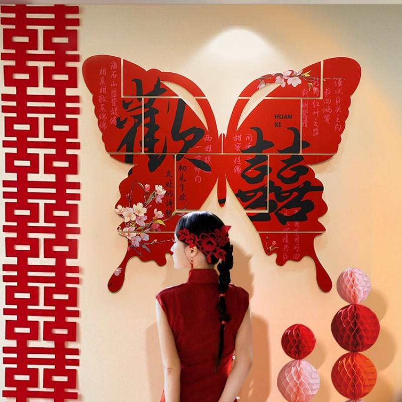 結婚部屋の配置セットのリビングルームの結婚装飾男性側の女性側の新築寝室の結婚式の大喜びの字の写真撮影の背景の壁