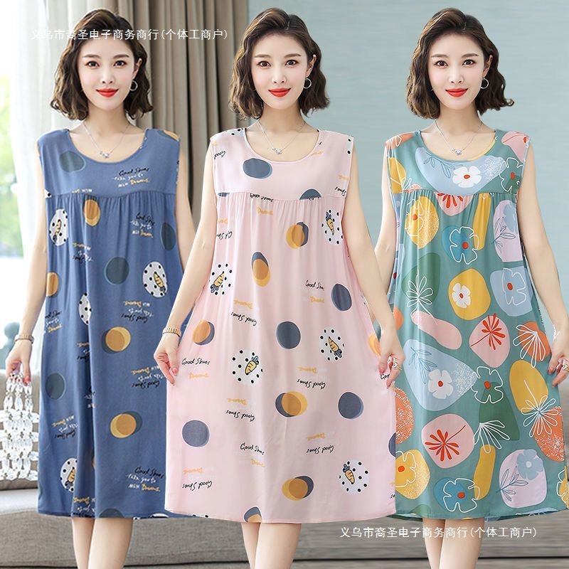 女性用ナイトガウン、夏、中高年、綿シルクノースリーブ新しいドレス、母親の人工綿ミドル丈のゆったりとしたホーム服