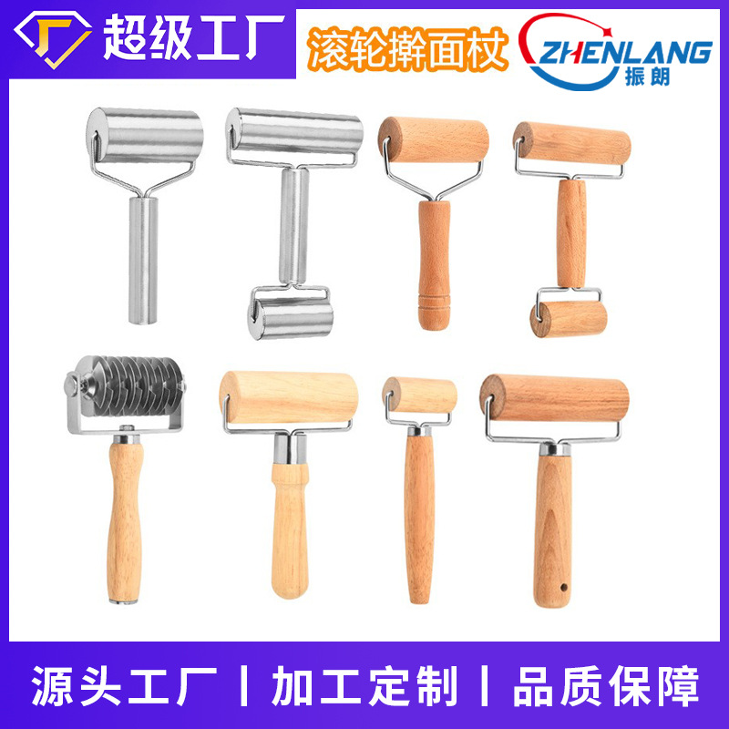 カスタマイズされた木製ハンドル麺棒、両頭ローラー、小麦粉スティック、ステンレス鋼生地引き網ローラーナイフ、ベーキング麺棒