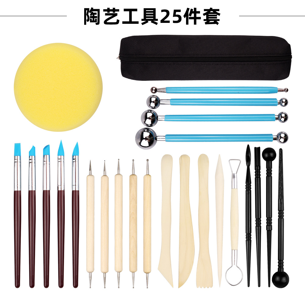 陶芸道具25点セット軟陶泥塑粘土道具ダブルヘッドドリルペンプラスチック丸棒樺木陶泥道具