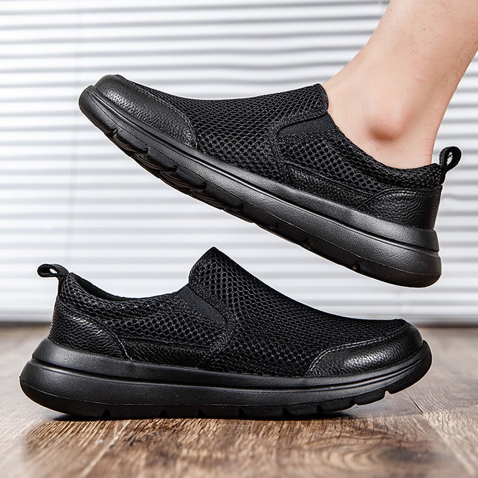 男性用カジュアルシューズ、夏用中空通気性スニーカー、スリッポンブラックウォーキングシューズ、軽量で多用途なスポーツシューズ