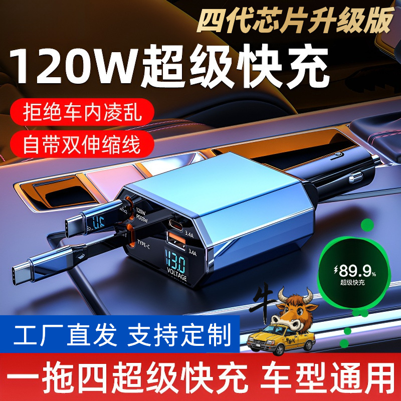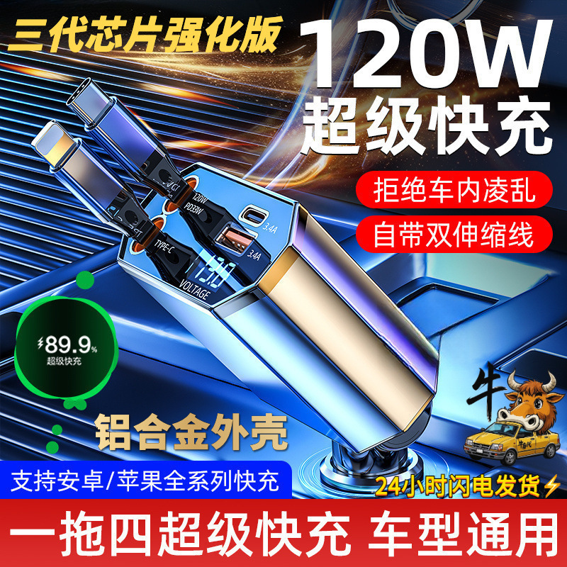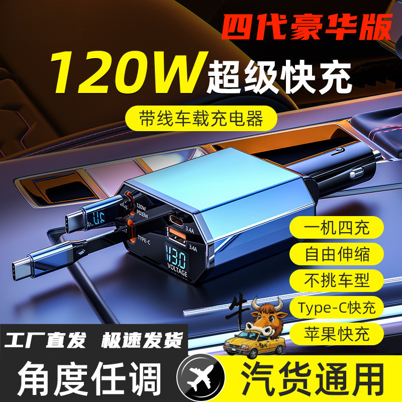 Niubi 120W 4-in-1 車用急速充電器伸縮ケーブルスマート電圧表示シガーライター変換ヘッド