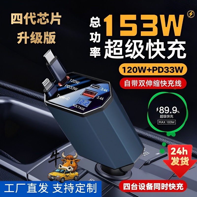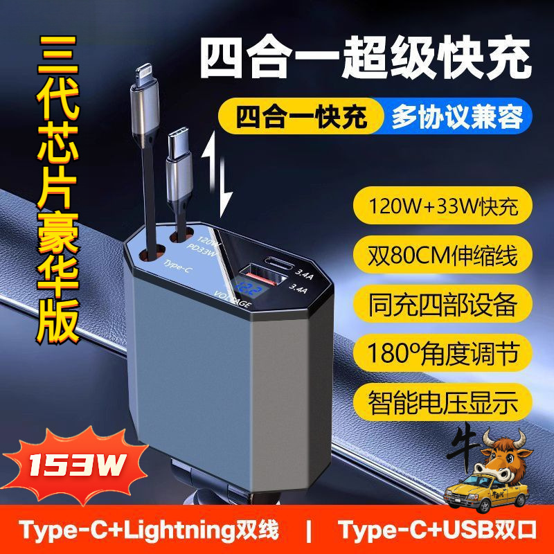 新しい 153W 4-in-1 車用充電器には、格納式ケーブル、超高速充電、スマート電圧表示アダプターが付属しています