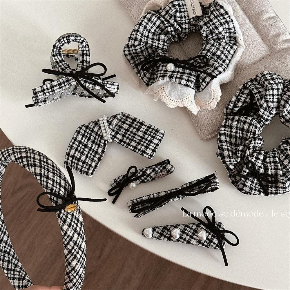 白黒の格子の布芸の蝶結びのヘアピンの日常の甘美な百合の質感の高級なカモの口は新型の髪飾りを挟みます。