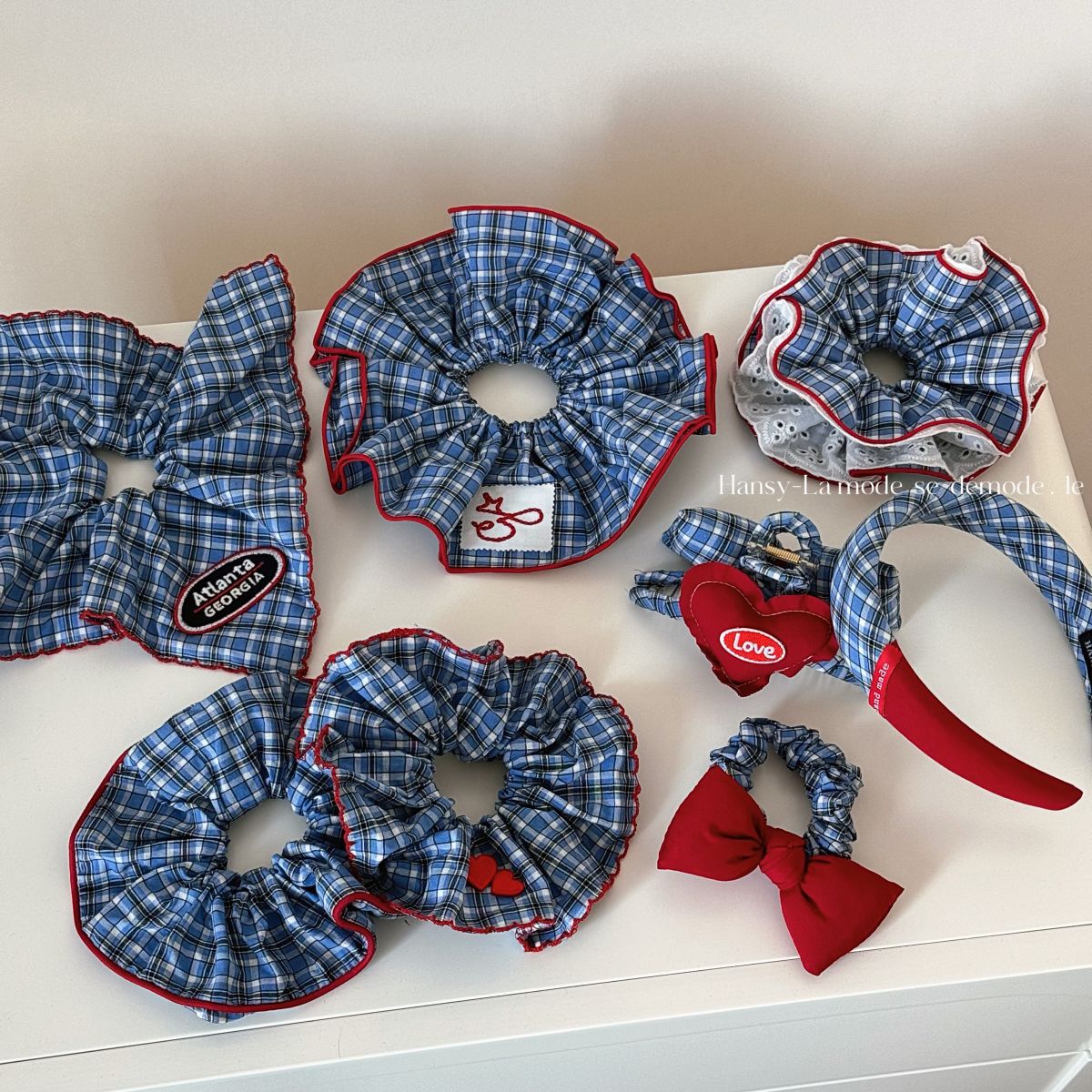 韓国風赤と青のコントラストチェック柄かわいい刺繍入りヘアロープポニーテールヘアロープゴムバンドデイリーヘアアクセサリー新しいスタイル
