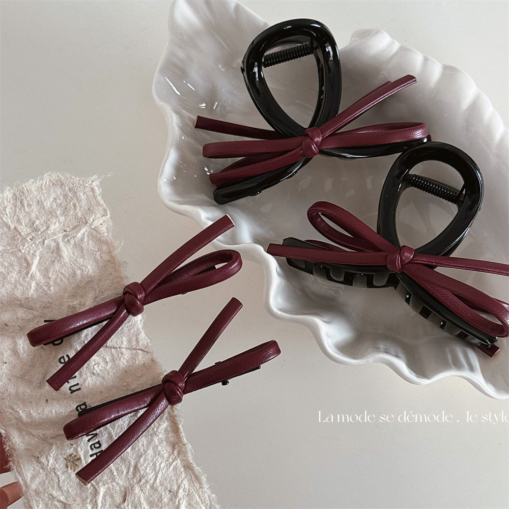 シンプルな質感のワインレッドの革の蝶結びの少女の髪はカモの口を挟みます。