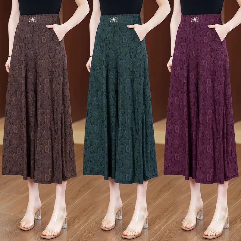 レトロプリントワイドレッグパンツ、女性用、夏用、薄手、ゆったり、ハイウエスト、着痩せ効果、カジュアルスカートパンツ、中高年ママ向け、中国風