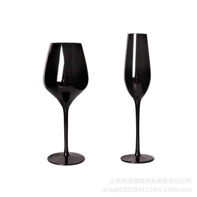 黒蝶ネクタイの赤ワイングラス、黒底の高脚ブルゴーニュクリスタルグラス、黒ガラスのシンプルなワイングラス