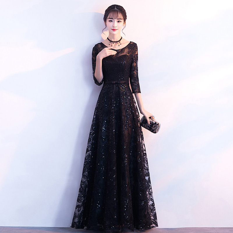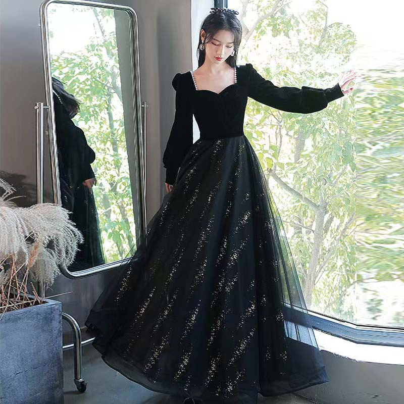 ブラックスパンコールパーティードレス2025新型長袖春秋気質フランス軽豪華司会者演出服