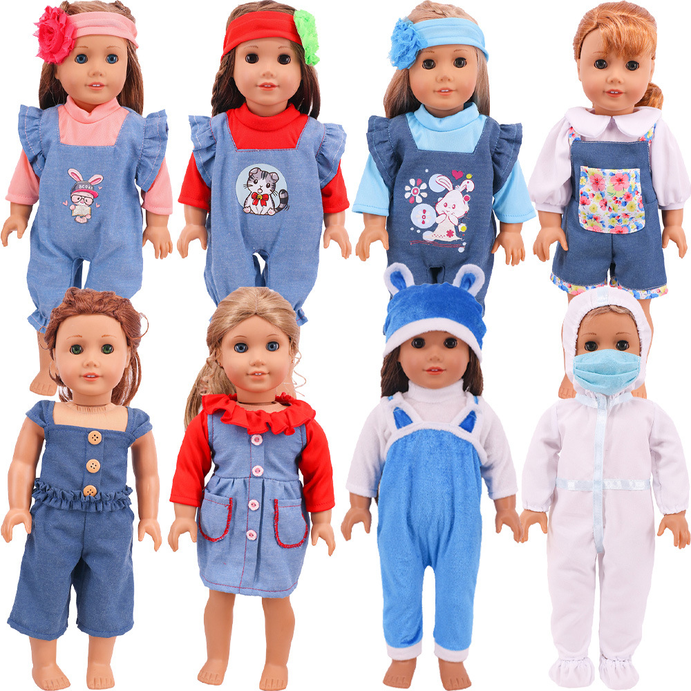 新しい18インチのアメリカの女の子の人形の服のデニムの背もたれのズボンの連体の医療用防護服のスーツの服の卸売り