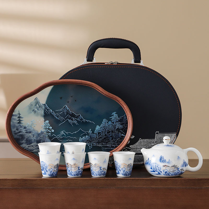 高級旅行茶道具羊脂玉磁器携帯ギフトボックスセット千里江山家庭用国潮陶磁器文創礼品