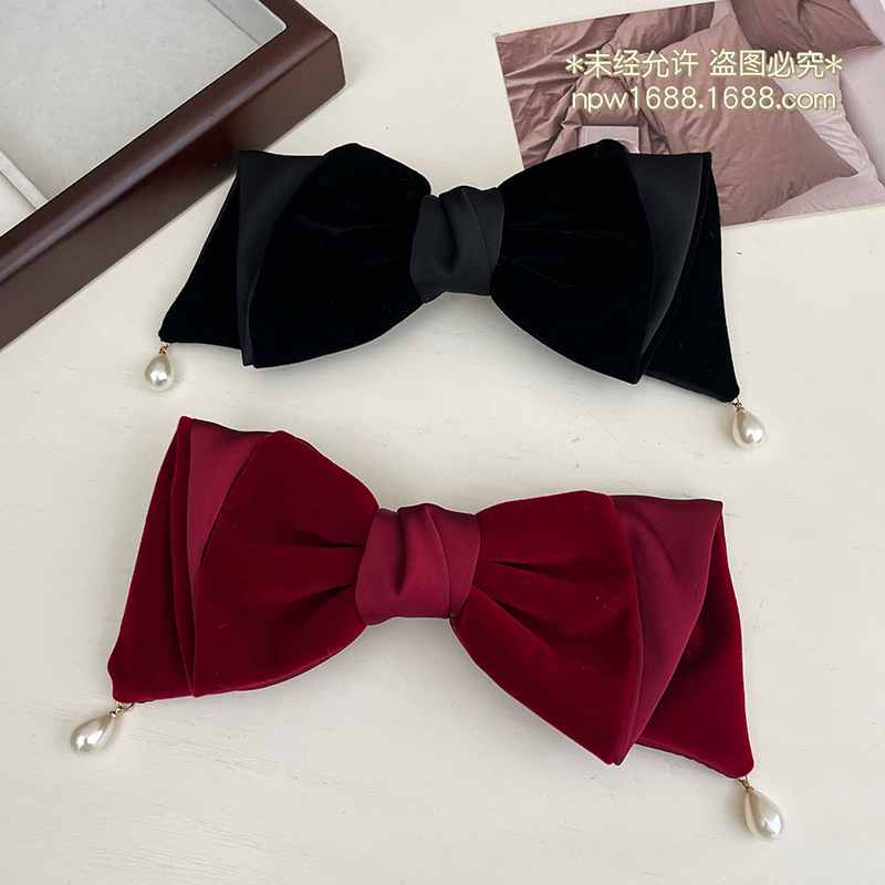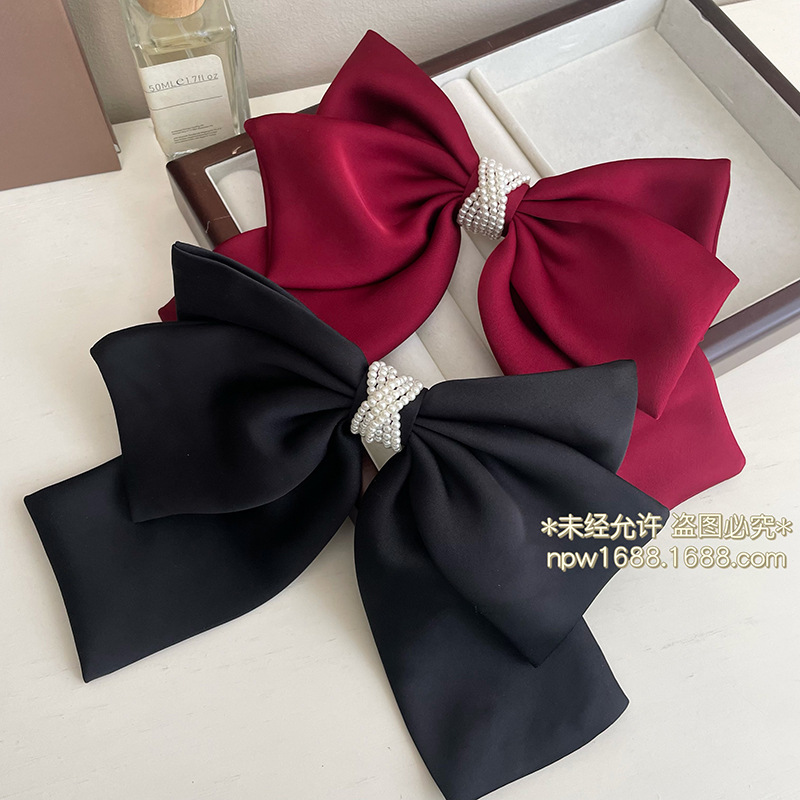 気質のサテンの蝶結びのヘアピンの大きい版の真珠の髪飾りの後頭部の馬尾のスプリングのクリップの頭飾りの2023新型