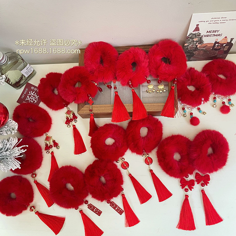 子供のぬいぐるみの髪輪の赤い新年の髪飾りの女の子は髪のゴムのひもの中国風のフリンジの頭飾りを結びます。